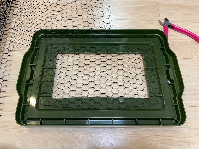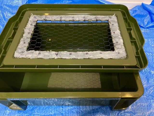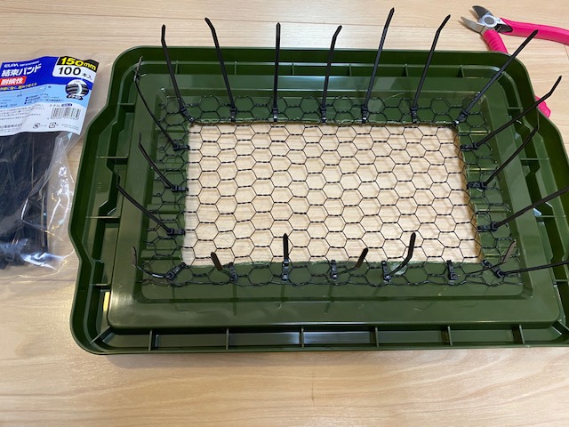 結束バンドを、コンテナのフタに開けた穴から通して金網を一周グルッととめたら長い部分をカットして完成。今回は、耐久性アップのためシリコンで仕上げ!
