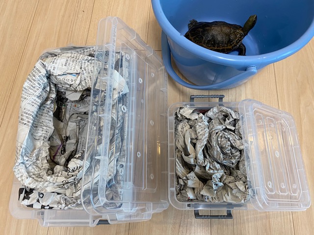 新聞紙やキッチンペーパーなどを、隙間なく詰めます。亀が中で動くと体力を消耗するため、呼吸できる状態でしっかりパッキングするのがコツだそうです。(これが、なかなか難しい)