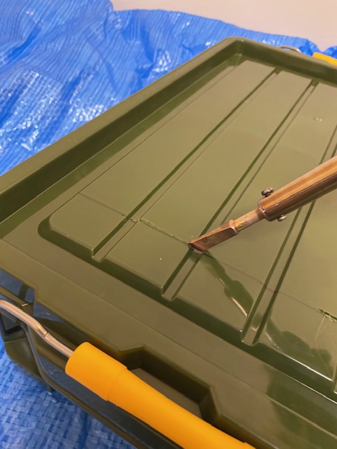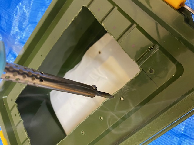 スミカッターでフタの縁を切って穴あけ。ヘッドを交換するだけで「カッター」「穴あけ」どちらにもなります。熱でプラスチックを溶かして切るので、ちょっと時間がかかります(笑)