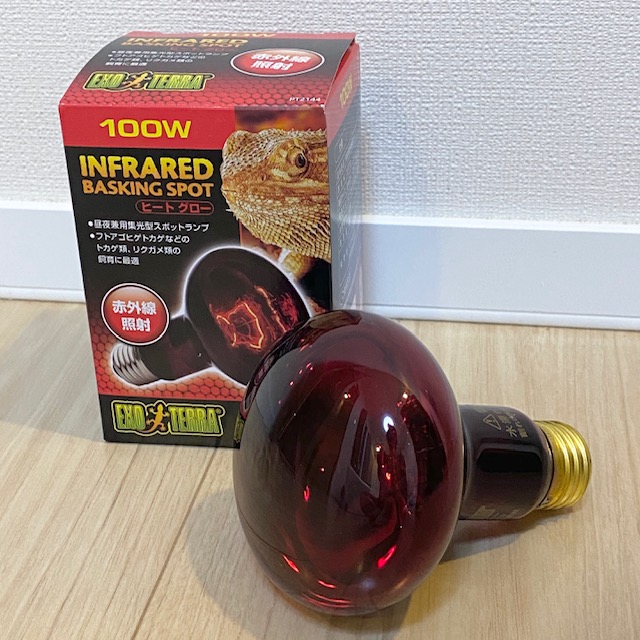 | ●保温球 ケージの一部にホットスポットを作る。昼・夜用でライトの色が違う。季節ごとにW数であたたかさを調整。 (画像: ヒートグロー赤外線スポット ¥2,180 | |