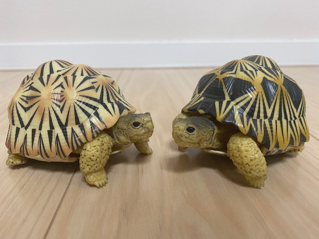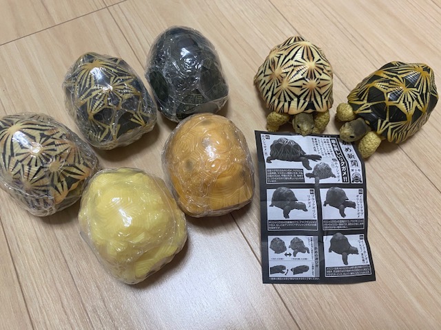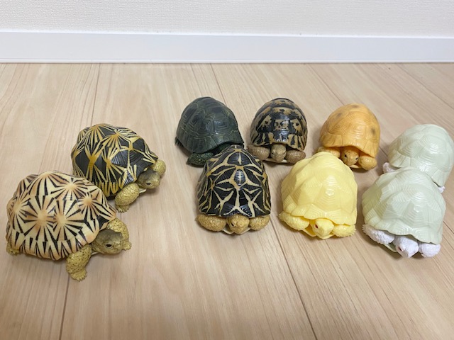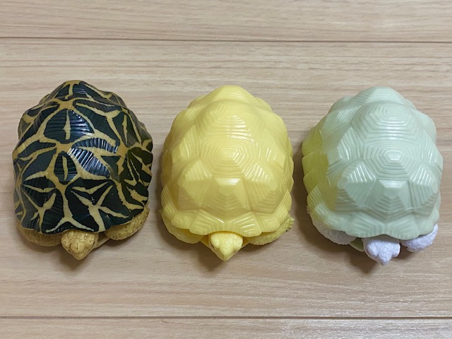 前回のガチャも含めて、インドホシガメのノーマル、アルビノ(白)、アルビノ(黄色)をコンプリート!インドホシのアルビノは生でみたことがありませんが、きっと実物も美しくて神秘的なんだろうなと思います。