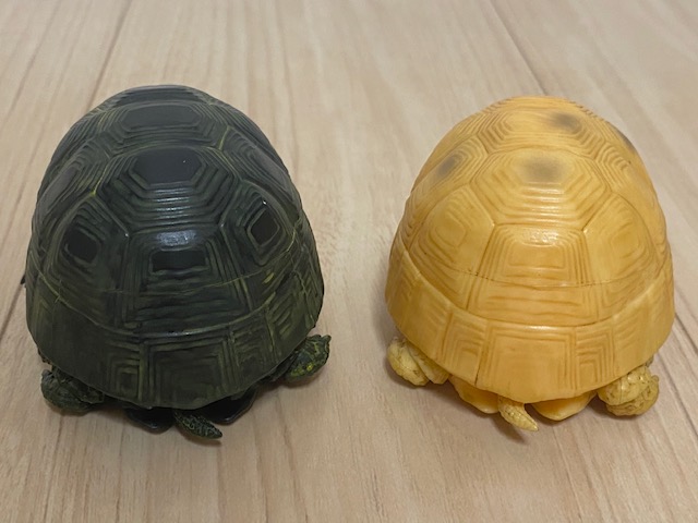 前回のガチャも含めて、ギリシャリクガメのノーマル、イエロー、ブラック、アルビノすべてコンプリート。やったね!こうしてみると、甲羅の色の違いが面白くて美しいですね。