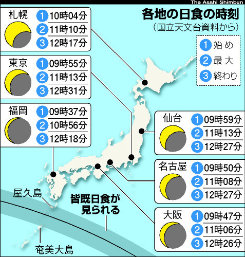 画像で 各地の日食時間と欠ける度合いの表がありましたので掲載しておきます