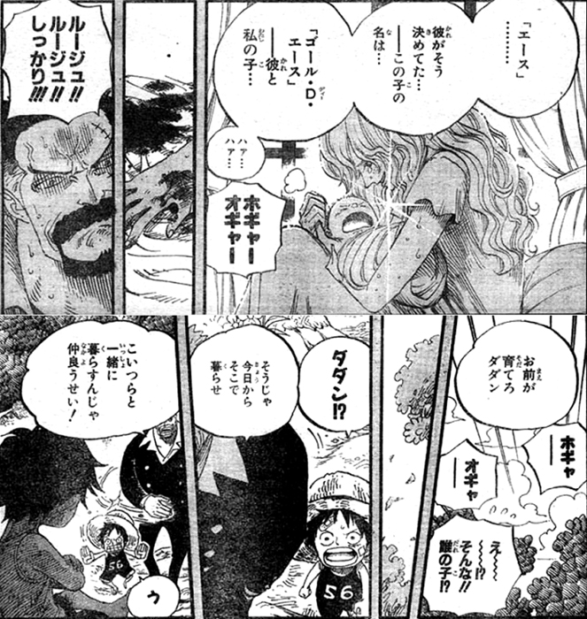 性別もルックスも不明ですが、ダダンは エースとルフィをガープが託した人物だという事が明らかになりましたね。ルフィがエースもいるダダンの許に託された時には、麦わら帽子と顔に自分で刺した傷があるので、第1話でシャンクス達を見送った後で 且つゴムゴムの実を食べた後という事になりますね。エースと出会ったのもこれが初めてのようです。