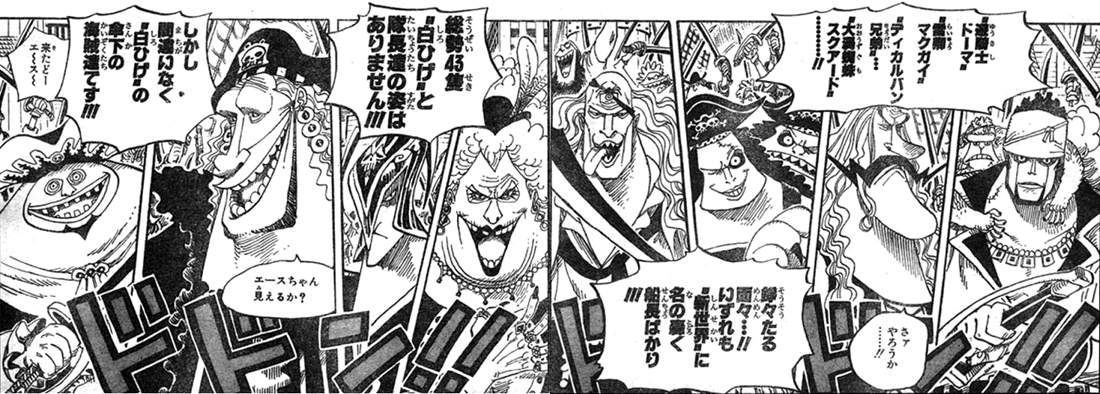 現れたのは、遊騎士ドーマ、雷卿マクガイ、ディカルバン兄弟、大渦蜘蛛スクアードなど いずれも新世界に名の轟く船長ばかり!総勢43隻の白ひげの傘下の海賊達!!