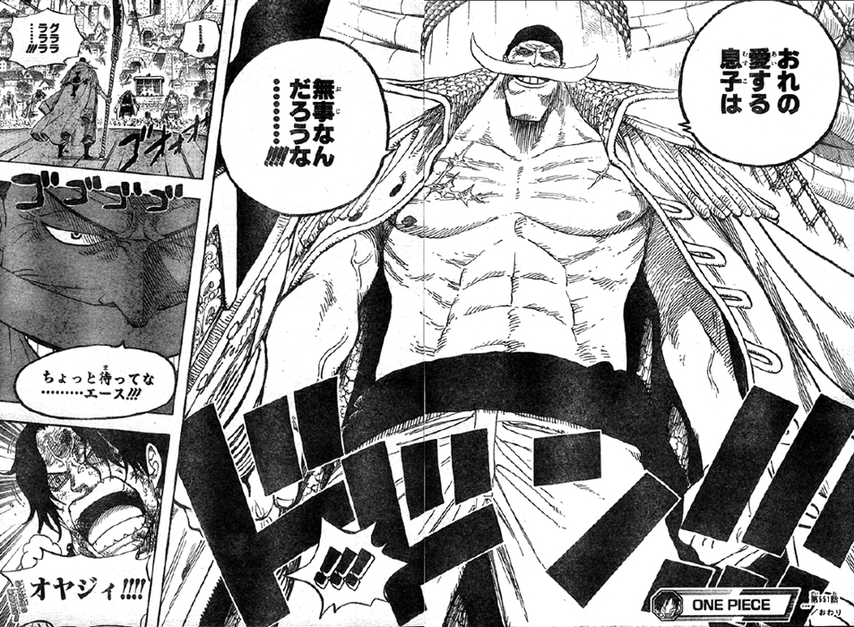 そして現在より2年前、エースが母親の姓ポートガス・D・エースを名乗りスペード海賊団の船長として卓抜した力と速度で海を駆け上がっていった時、海軍や白ひげはエースがロジャーの息子であると気付き、白ひげはエースを次の海賊王に育て上げるために かつてのライバル ロジャーの息子を自分の船にのせ 海軍から守っていたのです!放置すれば必ず海賊次世代の頂点に立つ資質を発揮し始めるエースを 今日ここで処刑する事は、たとえ白ひげとの全面戦争になろうとも海軍にとって大きな意味があります!