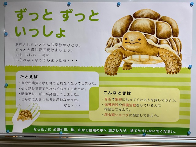 カメさんを飼えなくなってしまった時、どうすれば良いかが分かるポスター。うるっときちゃいます。こういった展示や、学術的な展示物もあります。