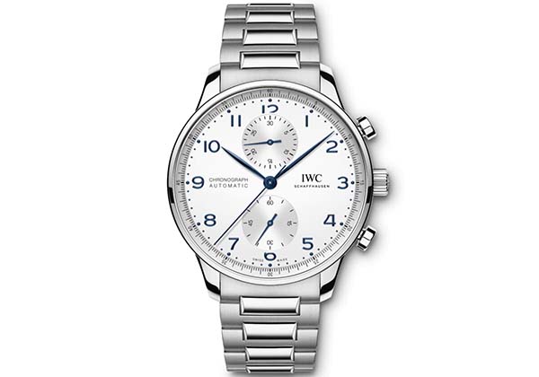 IWCコピー時計シャフハウゼン「ポルトギーゼ・クロノグラフ」Ref.IW371617 101万2000円(同デザインのアリゲーターストラップモデルRef.IW371605は、90万7500円)/自動巻き(自社製Cal.69355)、毎時2万8800振動、46時間パワーリザーブ。ステンレススチールケース(シースルーバック)&ブレスレット。直径41mm(厚さ13mm)。3気圧防水