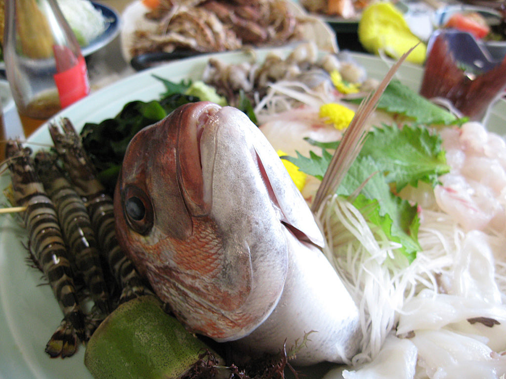 定番の船盛(船盛って頼んだのに、船が無いというオチ・・)これは写真写りがいいなあと思い撮ってみました。魚って逞しいですね、まだこいつ生きています。