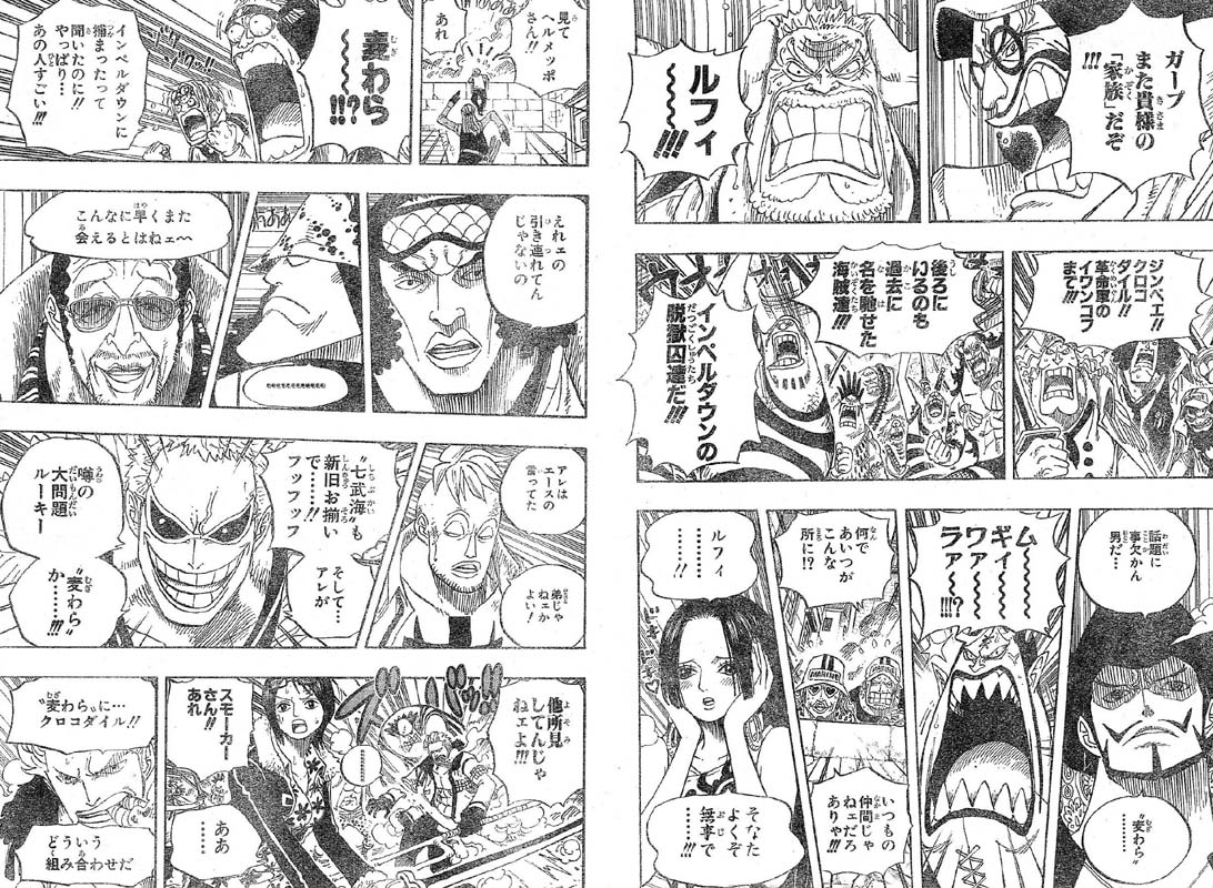 やっとエースとルフィが対面!!とんでもない面子に皆が驚いています!英雄ガープの孫にしてドラゴンの息子、そしてポートガス・D・エースの弟 大問題ルーキー モンキー・D・ルフィ、七武海ジンベエ、元七武海クロコダイル、革命軍エンポリオ・イワンコフ、過去に名を馳せた海賊達!!