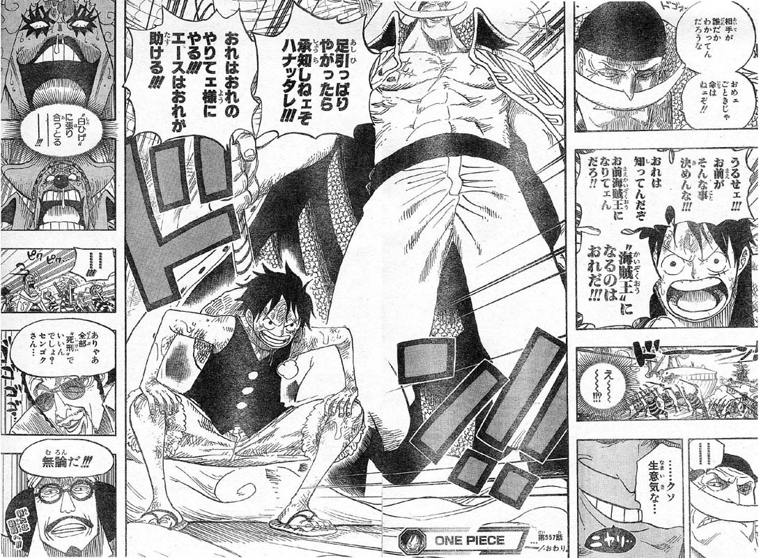 おめェごときじゃ命はねェぞという白ひげに対し、海賊王になるのはおれだ!!とルフィ!!!クソ生意気なルフィに笑みを浮かべる白ひげ!さすがルフィは白ひげに対してもビビるどころか 張り合っています!!そんなルフィに驚愕するイワンコフやバギー、Mr.3、脱獄囚達!!