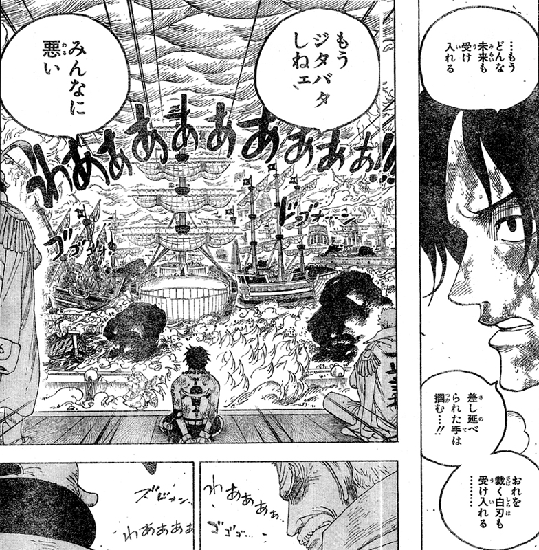 死んでも助けるという弟ルフィ、お前を傷つけた奴は誰一人生かしちゃおかないという仲間達の気持ちを理解し、「もうジタバタしねェ みんなに悪い」と覚悟を決めたエース!