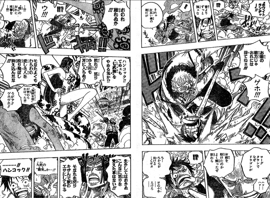 ルフィに海兵が大勢攻撃をし続けます!そこへスモーカーが海楼石入りの十手でルフィに攻撃!!ルフィのJET銃乱打は、自然系モクモクの実の能力者スモーカーの体を通過します!スモーカーは十手でルフィを抑え込みました!ルフィは海楼石の力により動けなくなってしまいました!そこで自然系のスモーカーを蹴り飛ばした人が!!覇王色の覇気を持つハンコック!!やっぱり覇気は悪魔の実の能力を無効化できるんですね!