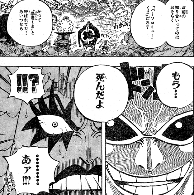 一方 革命軍幹部エンポリオ・イワンコフは くまと対峙していました!「ヴァターシの顔を忘れっタブルの!!?たいがいにせにゃあ反撃するよ」というイワ様に、ドフラミンゴが話しかけてもムダだと言います!「お前の知り合いってのは おそらくバーソロミュー・くまだろ?かつて暴君くまと呼ばれてた・・・あいつなら もう・・・死んだよ」