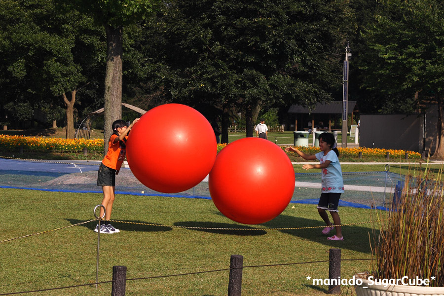 ボールの色が鮮やかであまりにもでかくて目をひいた。弾力がけっこうあるらしく弾ませて遊んでいた。