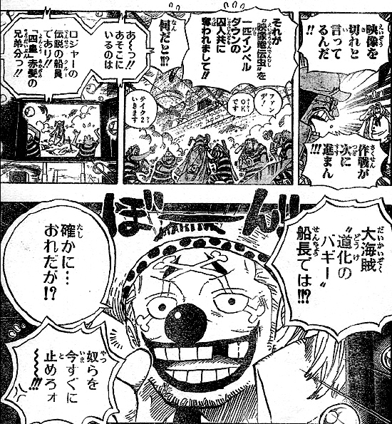センゴクの指示通り映像が切られるはずが、なぜか一つだけ切られない映像が!バギーとインペルダウンの囚人達!!映像電伝虫を奪ってバギーを全世界に中継していました!!こんなにも緊迫した戦場で なぜこんなにも面白いのでしょうか!