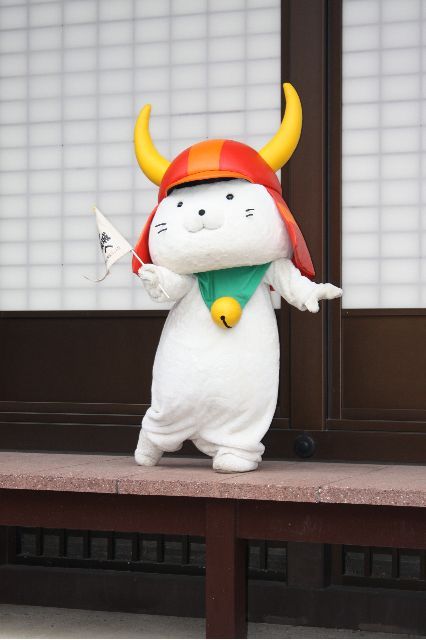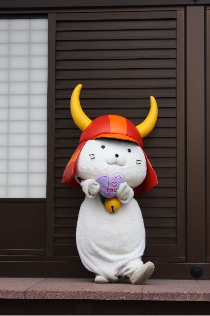 | 公式HPより。 彦根藩二代藩主である井伊直孝公をお寺の門前で手招きして雷雨から救ったと伝えられる"招き猫”と 井伊軍団のシンボルとも言える赤備え (戦国時代の軍団編成の一種で、あらゆる武具を朱塗りにした部隊編成のこと) の兜(かぶと)を合体させて生まれたキャラクター。 愛称の「ひこにゃん」は、全国よりお寄せいただいた1167点のなかから決定。 また、巷ではひそかに「モチ」という愛称も・・・・・ 趣味は散歩、彦根城の周辺を散歩するのが好き。 |