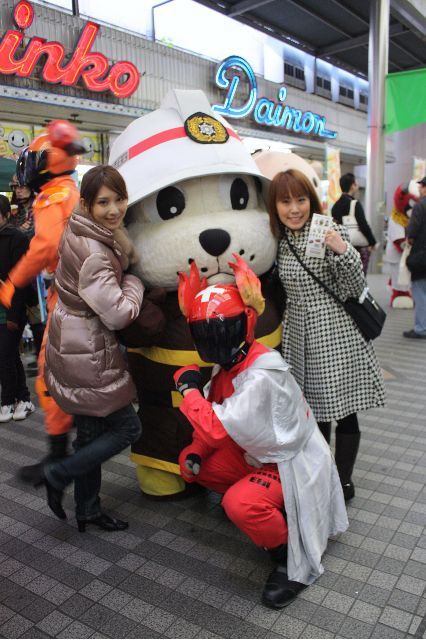 | その他 | 防火帽を四日市市消防署の方のご厚意で脱いだバージョンを撮影させて頂きました。 頭の形が丸くないのは身長と帽子のかぶりやすさなどを考慮しての形状の為 脱いだ状態は本来イレギュラーです。 名張市の199団ファイヤーレッドさんもマニアーナとの集合写真にご一緒しました 199団はローカルヒーロー道場に載せますのでお待ちください。 |
