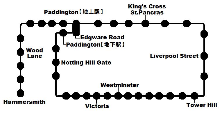 外回りはHammersmithが起点となり、Wood Lane→Paddington(地上駅)