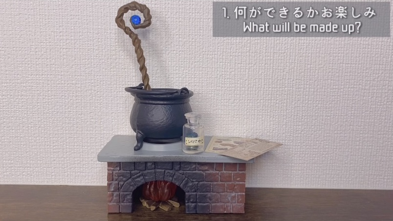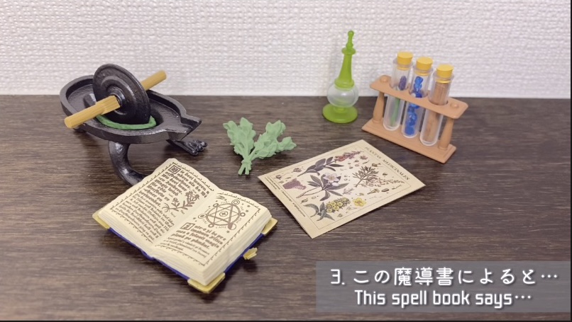 薬草をすりつぶして、魔導書通りに調合しているシーンを再現。