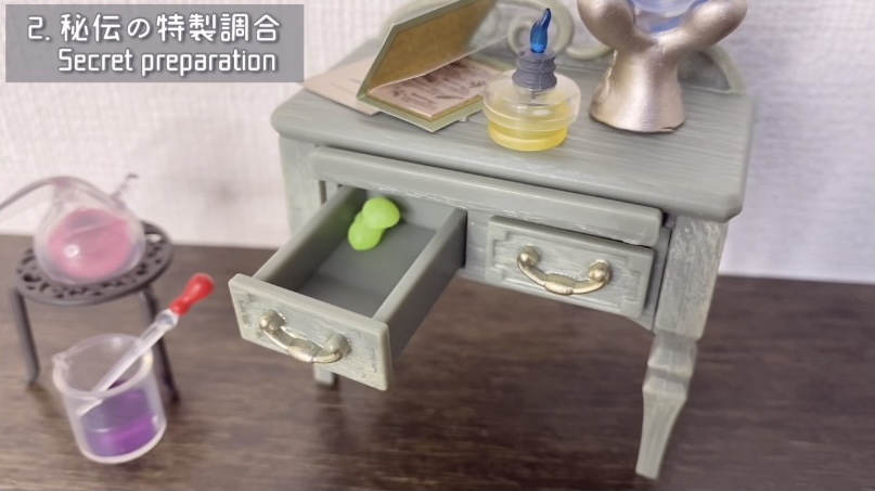 机の色味、木目、脚の形、引き出しの取手まで、精巧にこだわって作られていて感動。
