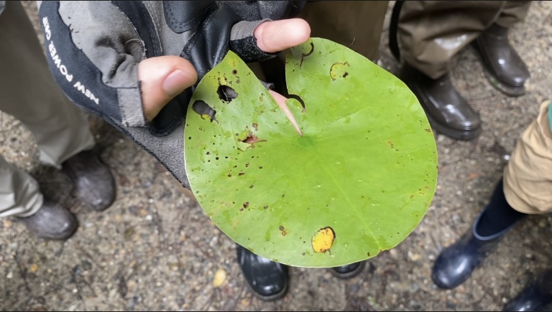 池のスイレンの葉についていた、亀の「はみあと」。亀が葉をかじると、このような穴が開きます、可愛らしいですよね!(笑)