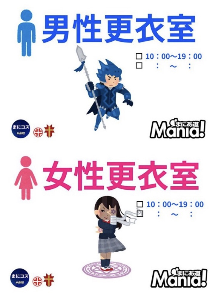 | 【1】男女別・更衣室(通常の更衣室) コスプレイベントでおなじみの男女別コスプレ更衣室。通常通りお着替えをされるほとんどのレイヤーさんは、こちらを使われます。 |