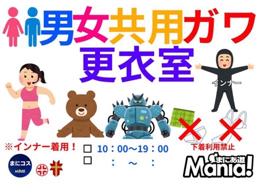 | 【2】男女兼用・ガワ更衣室 戦隊ヒーロ系・着ぐるみ・ガワコスなど、かぶりもの系レイヤーさんの更衣室。大きい荷物を置いたり、休憩にも使えます。 男女兼用更衣室のためインナー着用必須!下着や裸は禁止! |