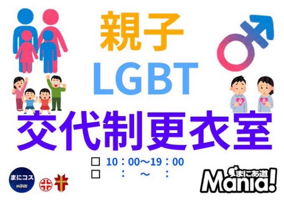 | 【3】特別更衣室(親子・LGBT対応) 着替えに手伝いが必要なお子さん、LGBTの方など、通常の更衣室での着替えが難しい方の更衣室。時間交代制。ご利用は受付まで。 現在、モリコロ会場のみ完備。他の会場は事前にお問い合わせください。 |