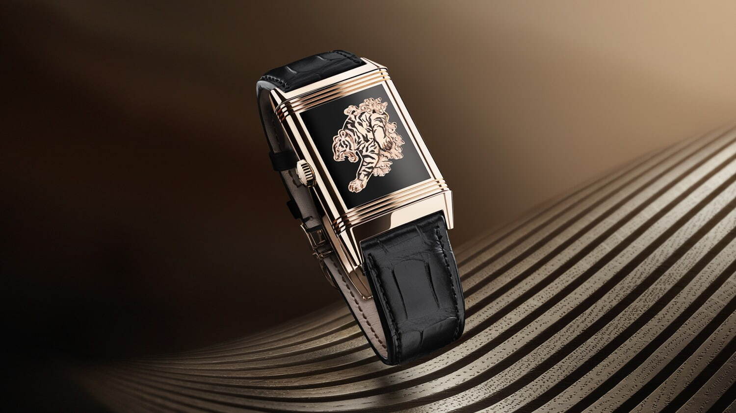 そんな「レベルソ」に、中国の旧正月を記念した新モデル「レベルソ・トリビュート・エナメル “タイガー”」が仲間入り。ピンクゴールド製のケースを回転させると、背景のオペークブラックのグラン・フー・エナメルから飛び出してきた様な、躍動感のある虎のモチーフが現れる。