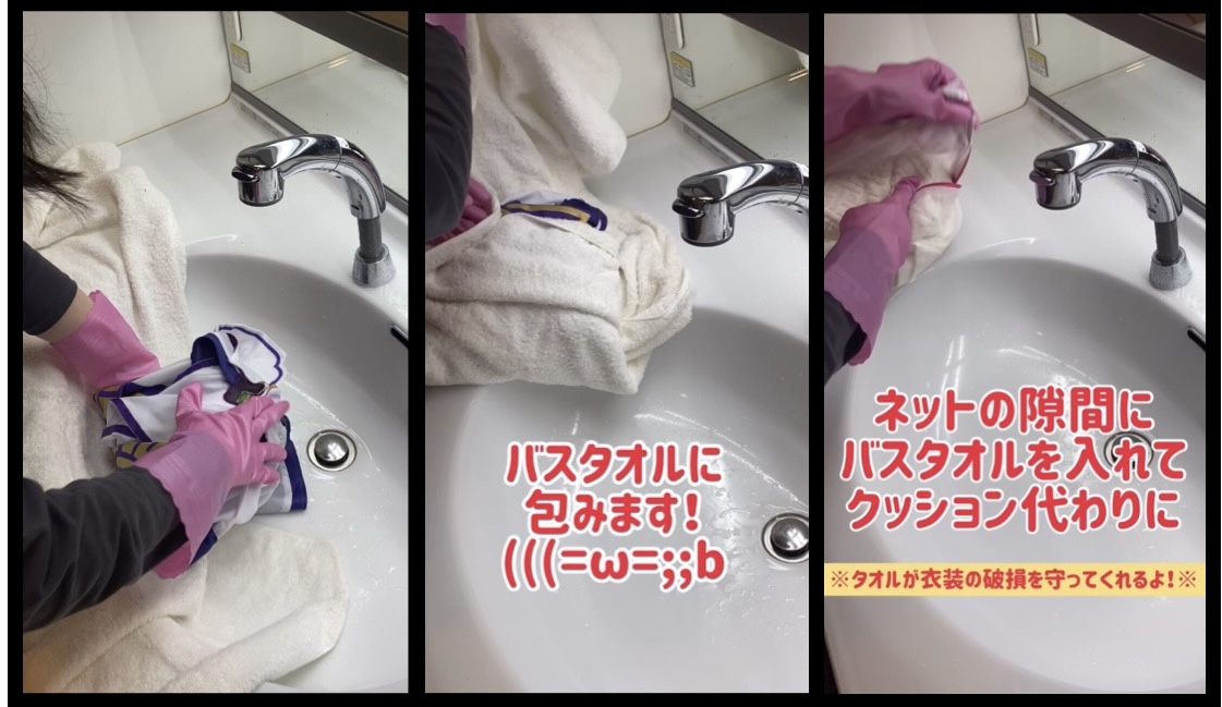 洗濯機に入れて脱水するとき、タオルが衣装の破損を守ってくれます。洗濯ネットと衣装の間に、タオルをしっかり詰めることがポイント。