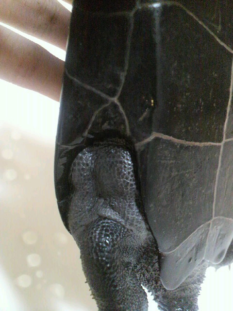 亀の肥満は、硬い甲羅はそのままで、脚の付け根に脂肪がつきます。太り続けると、甲羅に引っ込むことができなくなります。