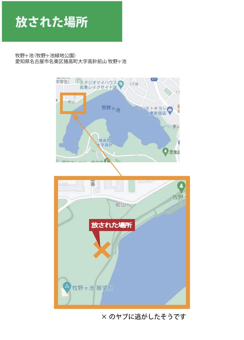 飼い主さんのツイートによると、警察の方は放流場所を教えてくれるのみで「捜索等はできない」とのこと。大変悲しまれており、牧野池でゴンちゃんをずっと捜索されていました。