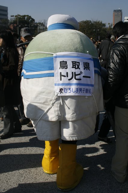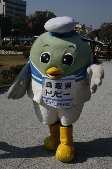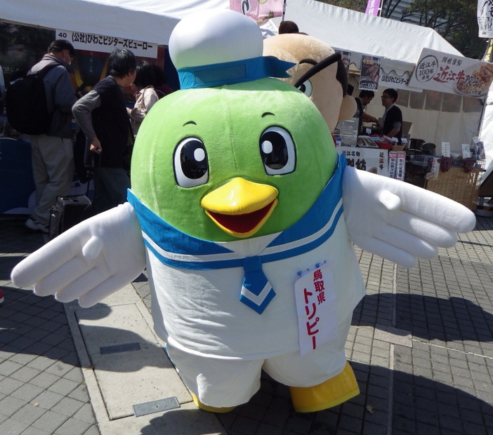 | 平成9年に境港市で開催された「山陰・夢みなと博覧会」のマスコットキャラクターとして誕生。 閉幕後も「人気があったのでなくすのが惜しい」事から県のマスコットとして定着。 鳥取県の特産物である「梨」をモチーフにし、博覧会のテーマの「翔け」から鳥を、また博覧会の名称「夢みなと博覧会」より「水兵」を表現しています。 スポレク仕様や「日本のまつり」仕様「げんきトリピー」仕様など多彩なバージョンが有ります。 |