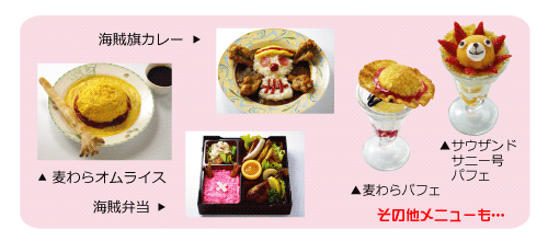 →麦わらオムライス、海賊弁当、サウザンドサニー号パフェなど