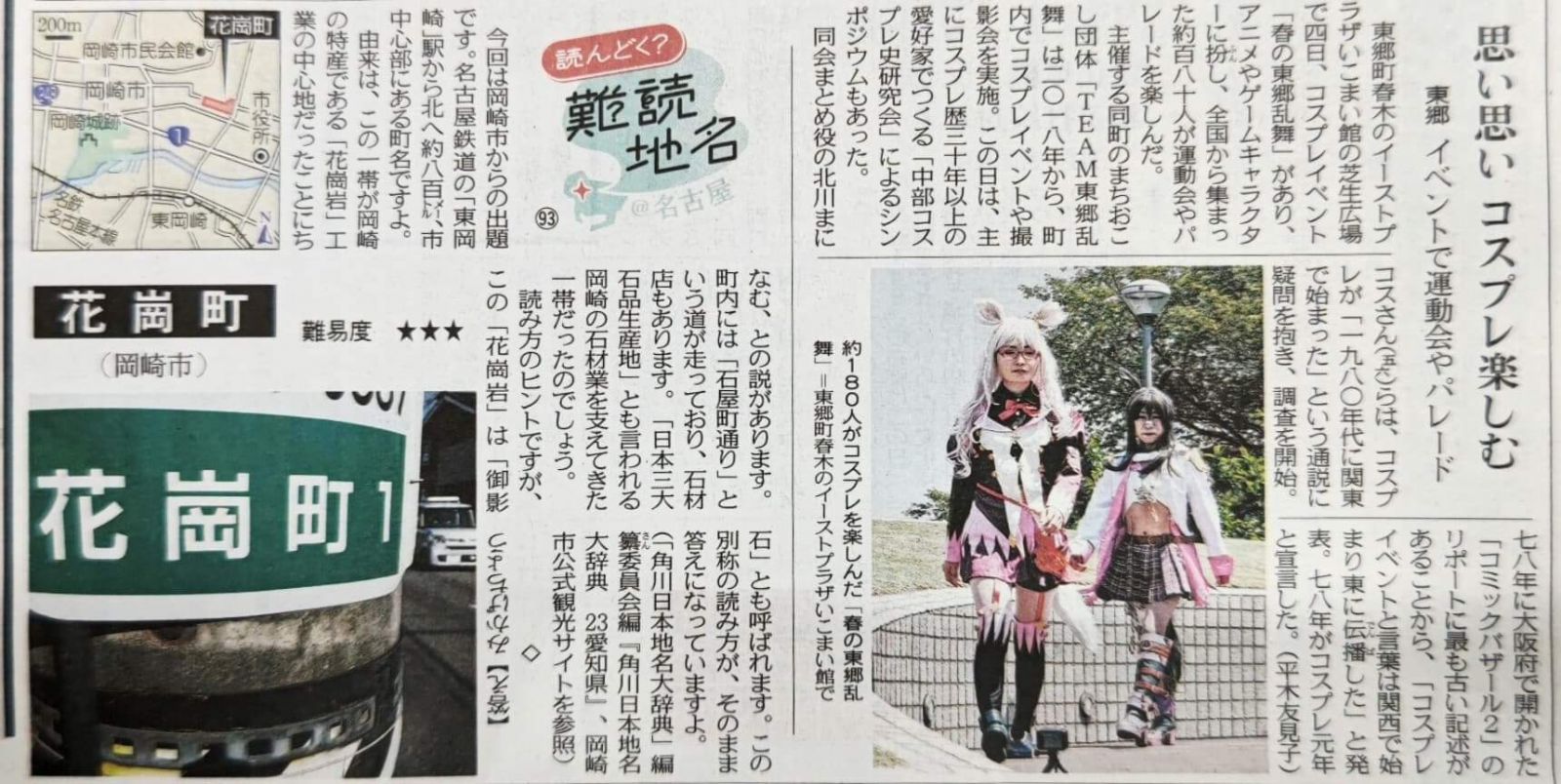 翌日の中日新聞さんにも、東郷乱舞さんのイベントとともに「中部コスプレ史研究会」を取り上げていただきました。
