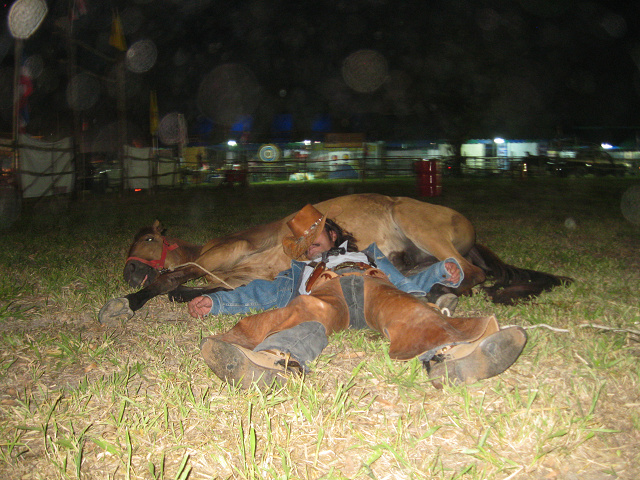 次の日は午前4時まで仲間と飲んでましたが、ちゃんと起きてました、この日のゲームは走り回る馬を捕まえて、サドルを付け、先にゲートをでると言うもので、妨害あり、誰の馬でも好いと言う、裏ルール付きの出来レースだと仲間がこっそり耳打ちしてくれたので、マイクでしつこく呼び出されましたが、馬を連れて堂々と退場しました、案の定、紅の豚の空賊達の大乱闘の再演です、見てる方はやらせだと判っていても爆笑でした、デブのメキシカンに二人係で飛び付いて、その隙にインディアンが馬を横取り、すかさず、カウボーイがとび蹴り、まるで漫画の世界に迷い込んだかのようで、はじめ馬を虐待してると、一人で怒ってた俺も最後は乱入したくてうずうずしてました。