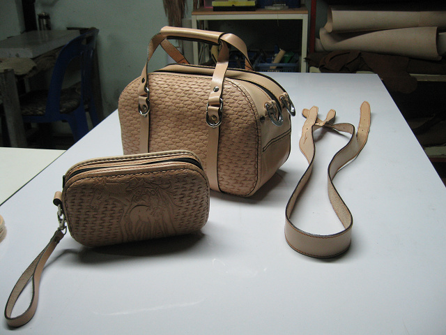 最近なぜか、水牛の革にはまってて、いわゆるバッファロースキンのサドルレザーなんですが、牛より硬く伸びにくいので、拠り深いカービングが打てるのです、写真のバックは二ミリの革なので深さが出しにくいのですが、三ミリ以上では、拠りボリュームの在るクラシックでダイナミックな図案が打てるのです、このバックでは硬さを生かして、牛より軽く丈夫な物に成ってます。