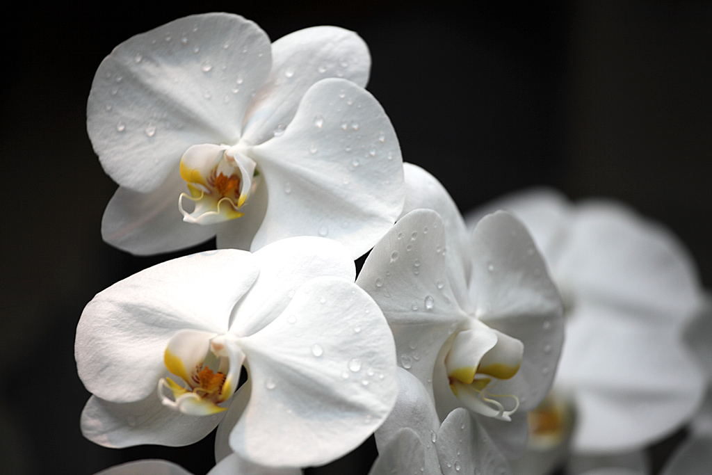 の荒業。ランの軟らかい葉脈とみずみずしい水滴。1024表示では完全ではありませんが、5Dmark2の本領
