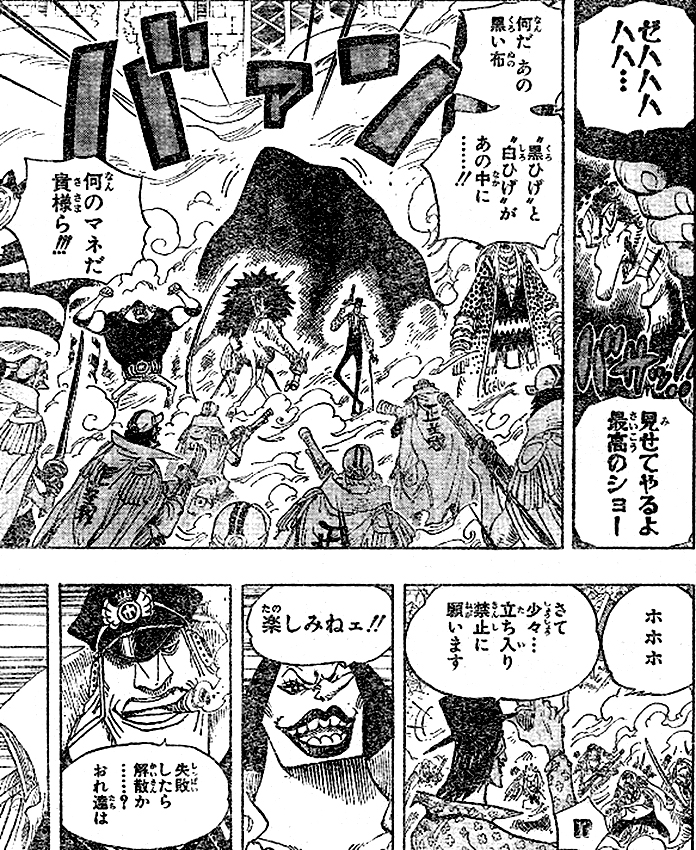 黒ひげがここで動きました!立ったまま絶命した白ひげに黒い布を被せ、最高のショーを見せてやるといい 白ひげの遺体と共に中に入りました!シリュウは、失敗したら解散か?などと言っています!