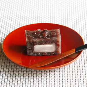 柔らかな求肥を丁寧に炊いた大納言小豆で包み、羊羹風に仕上げた優しい口当たり