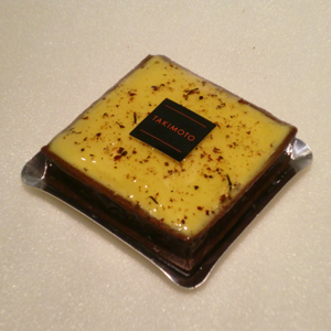 サブレショコラのタルト生地にイタリア ドモーリ社のショコラで作ったクレームショコラとクレームパッション(パッションクリーム)を流し入れ、仕上げにマダガスカル産ブラックペッパーをふりかけられている♪