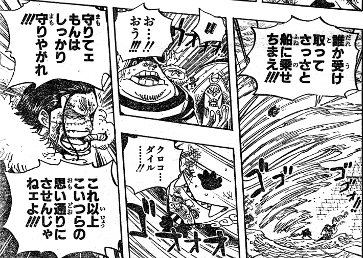 突然誰かが赤犬に攻撃!なんとクロコダイル!!砂嵐でジンベエとルフィを飛ばして助けました!クロコダイルが助けてくれるとは!!偶然にも二人をキャッチしたのはバギー!囚人達は お約束の勘違い!バギーは赤犬の攻撃を避けながら二人を抱えて逃げます!ナイスバギー!!傷が深そうなのにルフィを心配し続けるジンベエ!!