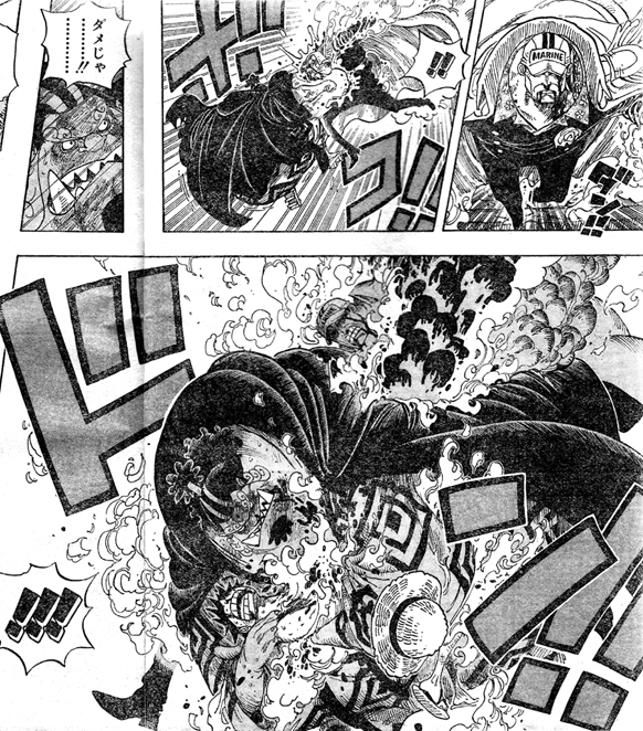 ルフィを守っていたイワ様、イナズマが赤犬の攻撃をくらった様です!大丈夫なんでしょうか!?赤犬は ルフィを狙って、ルフィを抱えたジンベエを追います!海に向かって跳んだジンベエ!しかし海は青雉によって凍らされてしまいました!迫ってきた赤犬!ジンベエが赤犬に拳を繰り出しますが大きなダメージは与えられず、赤犬の攻撃がジンベエを貫き ルフィも胸が抉れるほどの傷を負ったようです!!大怪我を負ったのにルフィの心配をするジンベエ!!