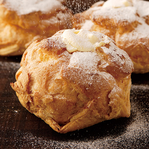 フランボワーズの人気商品「パリの朝市」。両手であふれるほどの大きなフォルム、ひと口ほお張ると、パイのサクサクした食感、その後に、香ばしいシュー皮を引き立てる口どけの良い生クリームが広がり、そして最後にコクのあるカスタードクリームが自然と溶け合う。徐々に折り重なる絶妙なハーモニーは、想像を超える美味しさに♪