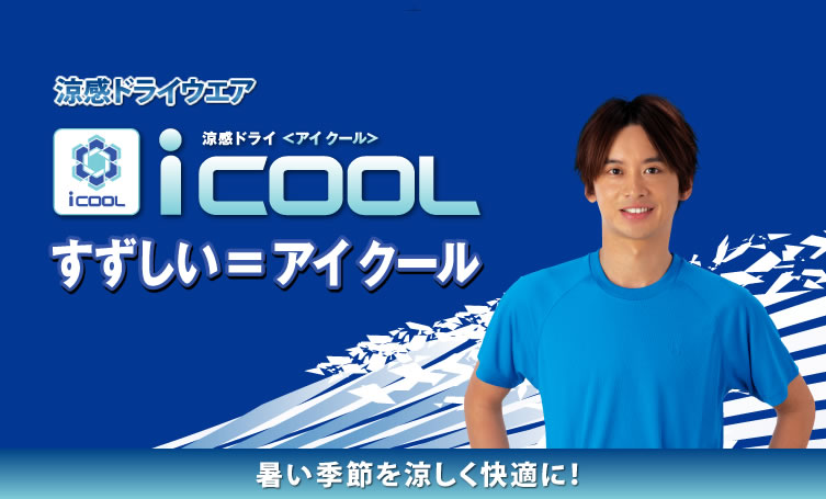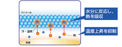 iCOOL(アイクール)は東レ(株)の先端技術によって開発した、涼感素材を使用している!単なるドライ機能とは異なり、体から発する汗や水分に反応し、周囲の熱エネルギーを吸収する先端テクノロジー素材!