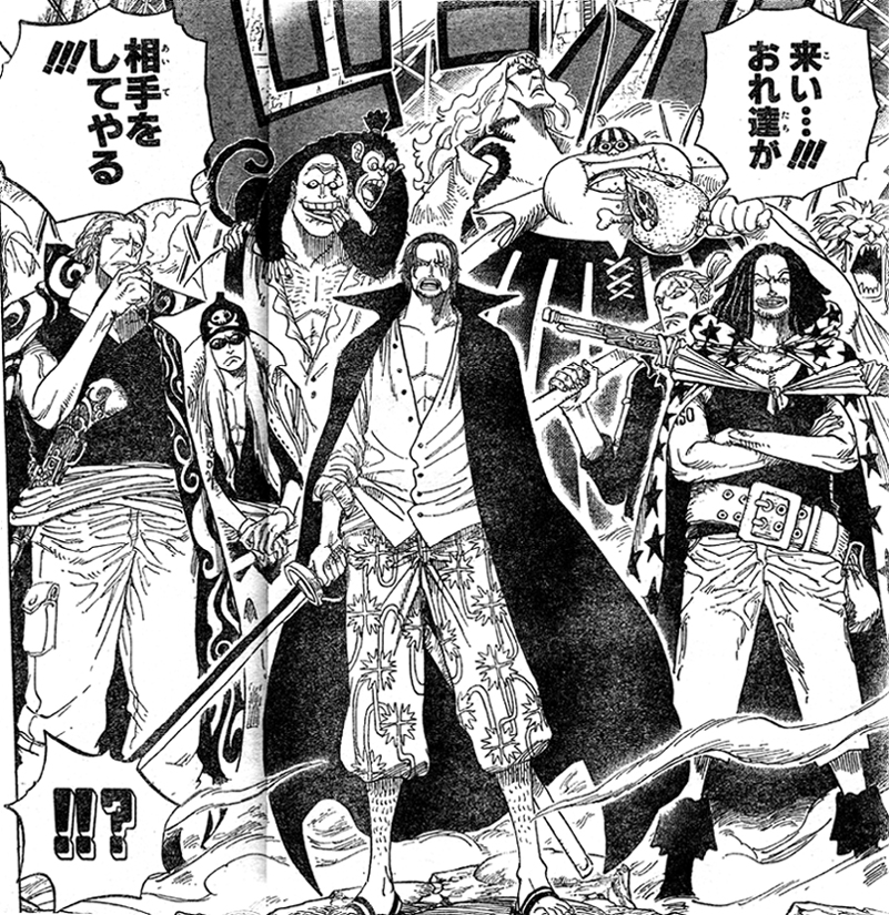 シャンクスはマルコに これ以上応戦するなと言います。鷹の目のミホークは、白ひげと戦う事は承諾したが 赤髪は協定の範囲外だと背を向けました!シャンクスは「これ以上を欲しても 両軍被害は無益に拡大する一方だ・・・!!!まだ暴れ足りねェ奴がいるのなら 来い・・・!!!おれ達が相手をしてやる!!!」と海兵・海賊へ言い、黒ひげへも問いかけます!黒ひげは 欲しい物は手に入れたしシャンクス達と戦うには まだ時期が早いと判断し撤退しました!