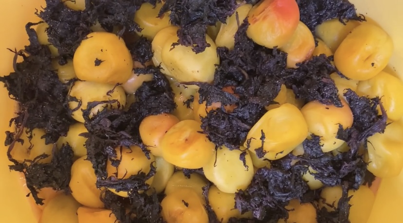 梅干しをつけて一週間ほどで、透明の梅酢が上がってきます。ひたひたになったら紫蘇を入れます。