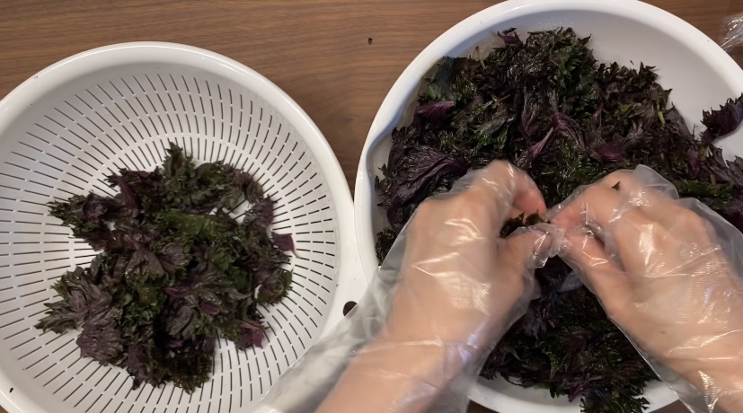 今回は、紫蘇の産地である愛知県大治町のもの。葉についた茎を、ちぎってとりのぞきます。