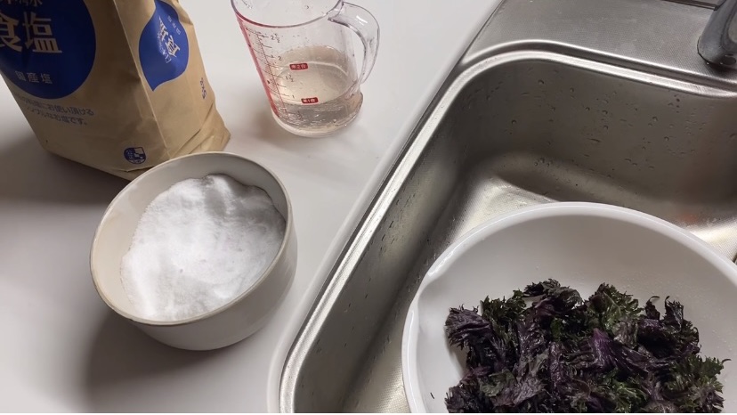 赤紫蘇の量は、梅の重さの約1割 。 塩は、赤紫蘇の重さの約2割が目安と言われます。梅が3kgなら、赤紫蘇は250〜300g、塩は40〜60gくらい。